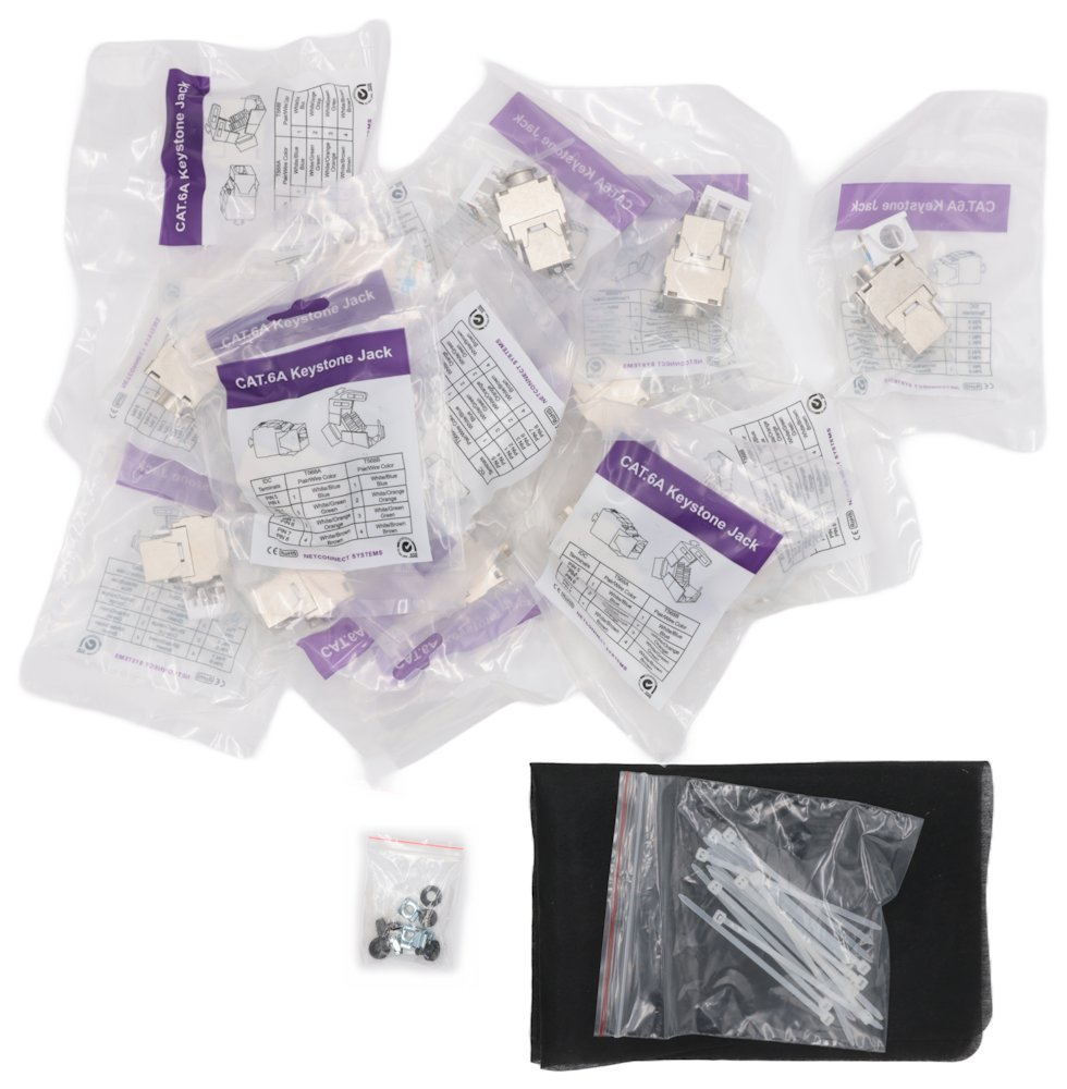 Propojovací patch panel neosazený se 16 porty + keystone 6A NETXTE1749 na zacvaknutí do panelu. Součástí těla panelu je vyvazovací lišta a zadní kabelový úchyt pro pevné připevnění kabelů.