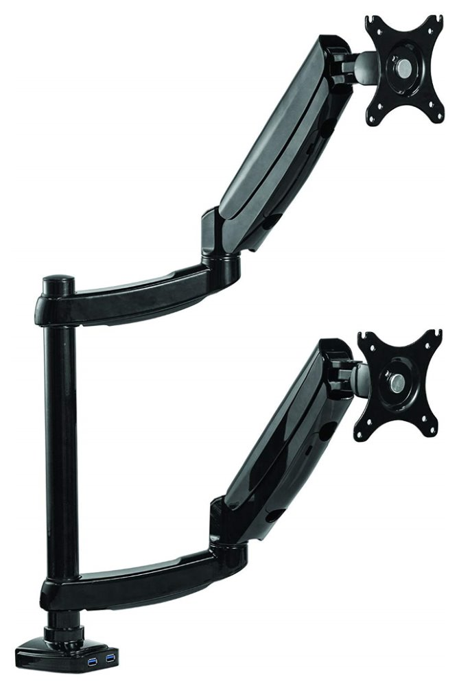 Nastavitelný držák pro dva monitory ušetří místo na pracovním stole. Je vhodný pro ploché LCD monitory o velikosti 17" až 30" a celkové hmotnosti do 20 kg. Snadno se připevní pomocí svorky nebo průvlaku na desku stolu. Technologie plynových pružin umožňuje snadné nastavení monitorů pro práci a sdílení obrazovky. Dva USB 3.0 konektory pak umožňují snadné připojení oblíbených zařízení. Intuitivní systém správy kabeláže minimalizuje nepořádek.