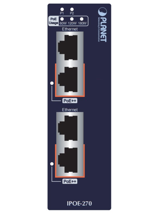 Průmyslový "Power over Ethernet Injector" IEEE 802.3bt s maximální zatížitelností 180 W pro napájení zařízení po Ethernetu. Designovaný pro použití s kamerami PTZ, dotykovými monitory, VoIP aparáty, POS (point of sale), kiosky, PoE osvětlení nebo Wi-Fi přístupovými body.