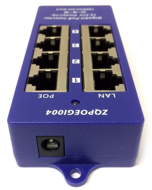 PoE injektor, panel, pasivní, 4portový, stíněný, LED, modrý