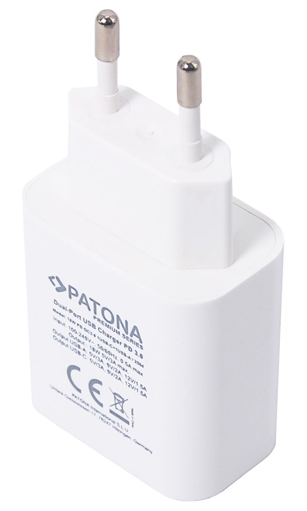 Napájecí adaptér PATONA s výkonem 18 W pro tablety a smartphony. Pro nabíjení zařízení jsou k dispozici konektory USB a USB typu C s podporou Power Delivery. Samozřejmostí je ochrana proti přehřátí a přepětí.