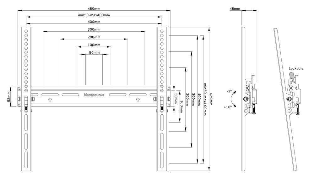 Rozměry VESA: 50 × 50, 75 × 100, 75 × 200, 75 × 75, 100 × 100, 100 × 150, 100 × 200, 100 × 75, 120 × 120, 200 × 100, 200 × 200, 200 × 300, 200 × 400, 300 × 100, 300 × 200, 300 × 300, 350 × 350, 400 × 200, 400 × 300, 400 × 400 mm