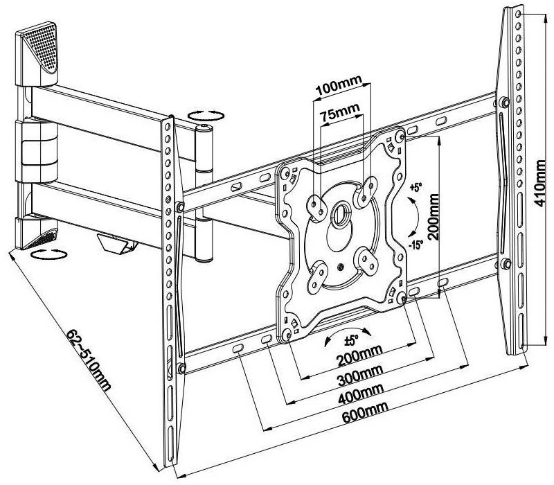 Otočný a sklopný nástěnný držák pro ploché obrazovky s úhlopříčkou od 42" do 70" a hmotností až 40 kg umožňuje díky technologii náklonu -15° až +5°, úhlu otáčení -90° až +90° a rotaci -5° až +5° nastavit jakýkoliv úhel pohledu pro maximální flexibilitu při sledování obrazovky. Intuitivní systém správy kabeláže minimalizuje nepořádek. Hloubka držáku je snadno nastavitelná od 6 do 51 cm. Držák je kompatibilní se standardy VESA 75 × 75 až 600 × 400 mm.