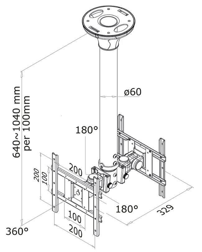 Flexibilní stropní VESA držák pro dva ploché LCD monitory o velikosti 10" až 40" a hmotnosti do 2× 10 kg. Univerzální technologie naklápění, otáčení a rotace umožňuje optimální nastavení. Držák je manuálně výškově nastavitelný v rozmezí od 64 do 104 cm a je vhodný pro obrazovky nebo televize, které splňují vzor otvorů VESA 75 × 75 až 200 × 200 mm. Veškerý instalační materiál je součástí výrobku.