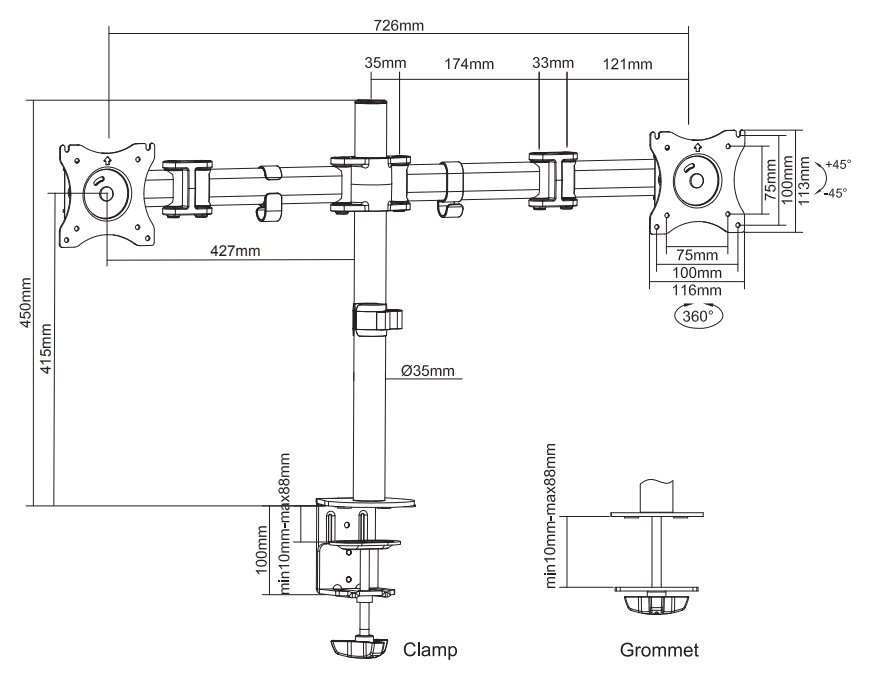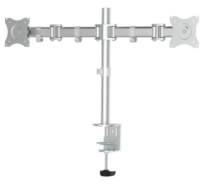 Flexibilní stolní VESA držák pro 2 ploché LCD monitory o velikosti 10" až 27" a hmotnosti do 16 kg (2× 8 kg). Univerzální technologie naklápění, otáčení a rotace umožňuje optimální nastavení. Veškerý instalační materiál je součástí výrobku.