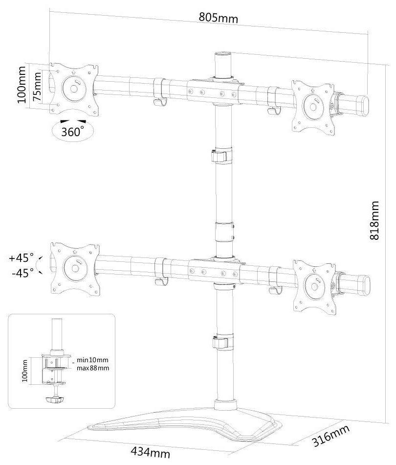 Flexibilní VESA stojan pro 4 ploché LCD monitory o velikosti 10" až 27" a nosnosti do 32 kg (4× 8 kg). Stojan je možné manuálně zvýšit až do 81 cm a je vhodný pro obrazovky, které splňují vzor otvorů VESA 75 × 75 nebo 100 × 100 mm. Různé vzory otvorů lze pokrýt pomocí VESA adaptérů. Veškerý instalační materiál je součástí výrobku.