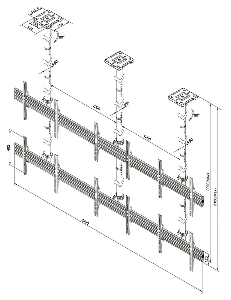 Stropní VESA držák pro 6 plochých monitorů či TV s úhlopříčkou od 32 do 65" a hmotností až 6× 30 kg. Držák je vhodný pro obrazovky, které splňují vzor otvorů VESA 100 × 100 až 600 × 400 mm.