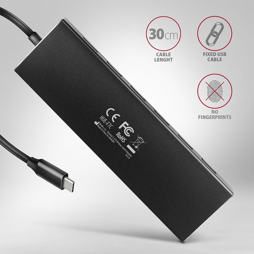 Rozbočovač v odolném hliníkovém provedení připojí k počítači až sedm USB zařízení současně. Velkou výhodou je možnost externího napájení hubu z jakékoliv nabíječky mobilních zařízení s micro USB konektorem. Zvládne trvalé připojení až tří externích disků i bez vlastního napájení a s vlastním napájením je možné připojit až pět 2,5" magnetických externích disků. Zároveň lze nabíjet smartphony, tablety, powerbanky a další zařízení proudem až 1,5 A (v závislosti na použité nabíječce). Rozbočovač je možné používat i bez počítače, pokud je k němu připojená nabíječka. V tom případě bude fungovat jako samostatný nabíjecí USB hub. Připojení hubu k počítači je indikováno modrou LED.