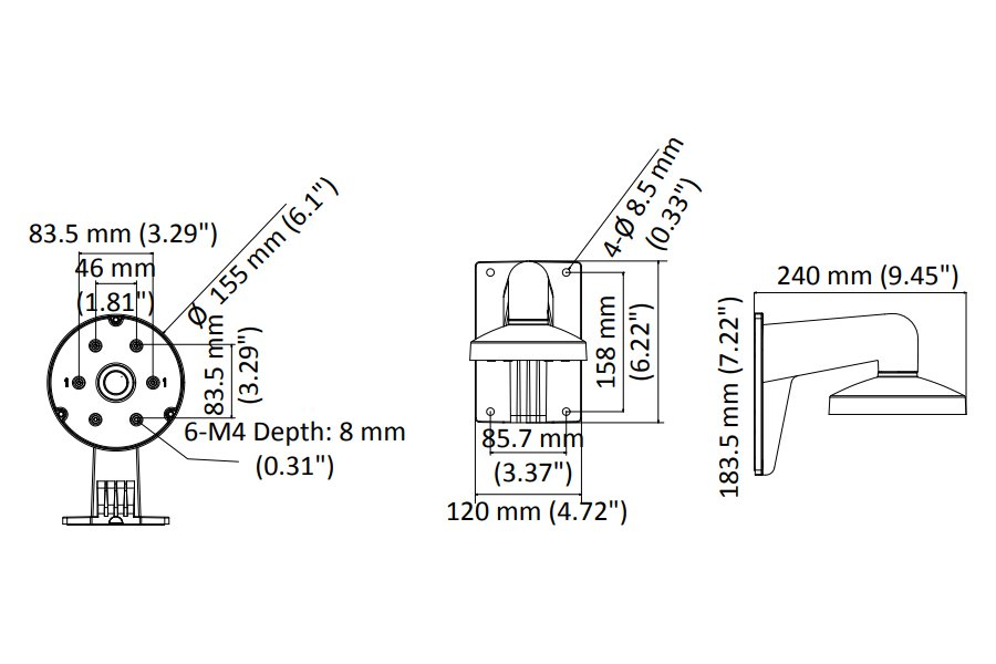 Držák pro montáž dome kamer na zeď, zatížitelnost 3 kg. Zeď musí unést více než 3krát větší hmotnost, než je celková hmotnost kamery a držáku.