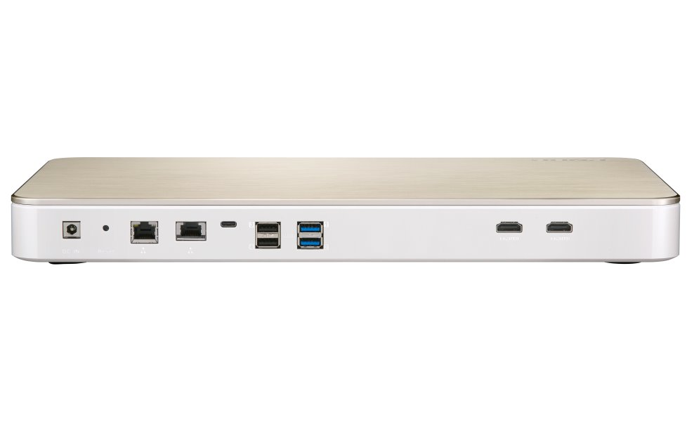 Designové síťové úložiště pro synchronizaci, vzdálený přístup a domácí zábavu. Základem tohoto zařízení je čtyřjádrový procesor Intel Celeron J4115, taktovaný na 1,8 GHz, doplněný o 8 GB operační paměti. Pro ukládání dat jsou připraveny dvě pozice pro 3,5" nebo 2,5" disky. Vysokorychlostní síťové připojení zajišťují 10GbE a 1GbE RJ-45 porty. K dispozici jsou také čtyři USB a jeden USB-C konektor. Výstup HDMI 2.0 (4K při 60 Hz) umožňuje užívat si vysoce kvalitní videa na 4K HDTV. V neposlední řadě jsou předností dva sloty M.2 SATA, které umožňují použití SSD cache pro zvýšení výkonu čtení/zápisu. Samozřejmostí je šifrování AES-NI pro svazky a sdílené složky. Díky provedení bez ventilátoru a s nízkými vibracemi si můžete plně vychutnávat multimédia bez rušivého hluku. Součástí balení je dálkové ovládání.