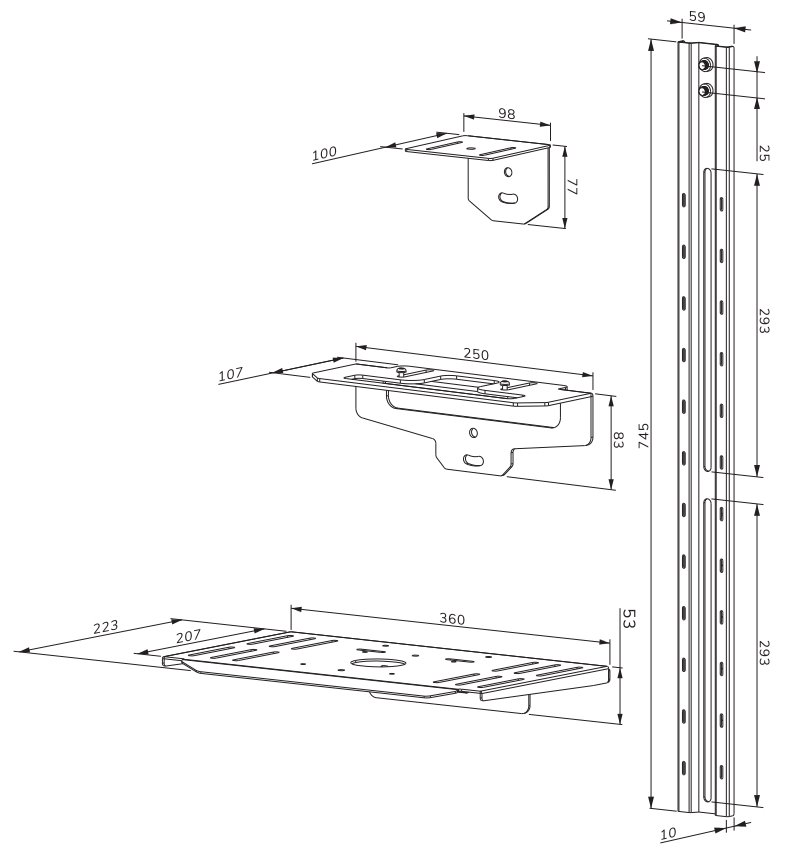 Police o šířce 36 cm a držák webkamery pro mobilní stojan FL50S-825BL1. Balení obsahuje také adaptér pro zařízení Bose VB1 a VB-S. Univerzální polici lze instalovat na přední i zadní stranu držáku.