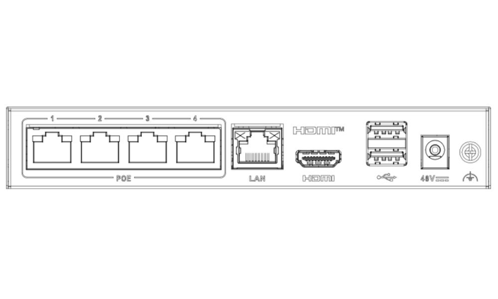 Porty: 1× HDMI Full HD výstup, 2× USB 2.0, 1× RJ-45 (10/100 Mbps), 4× RJ-45 (PoE podpora)