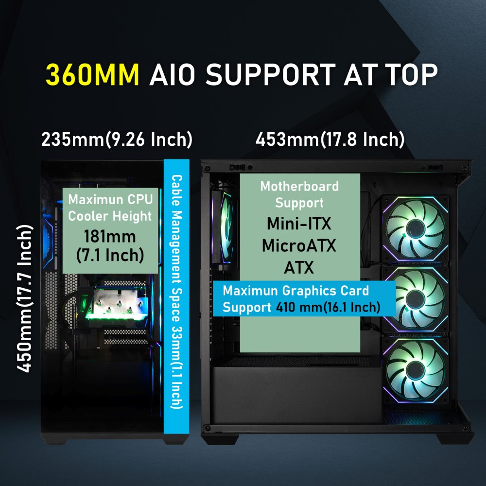 Herní počítačová skříň nabízí stylovou prosklenou bočnici i přední panel a prvotřídní kovovou konstrukci. Skříň je osazena čtyřmi ventilátory o velikosti 120 mm s ARGB podsvícením a efektem nekonečného zrcadlení. Potěší také možnost rozšíření o další 3 ventilátory. Samozřejmostí jsou také prachové filtry. Důmyslné řešení umožňuje pohodlné umístění až 360 mm dlouhého výměníku vodního chlazení na horní straně. Ve skříni je dostatek prostoru pro chladič CPU do výšky až 181 mm a grafickou kartu o délce až 410 mm. Na horním panelu se nachází dva porty USB 3.0, jeden port USB-C, sluchátkový výstup a vstup pro mikrofon. Skříň je dodávána bez zdroje.
