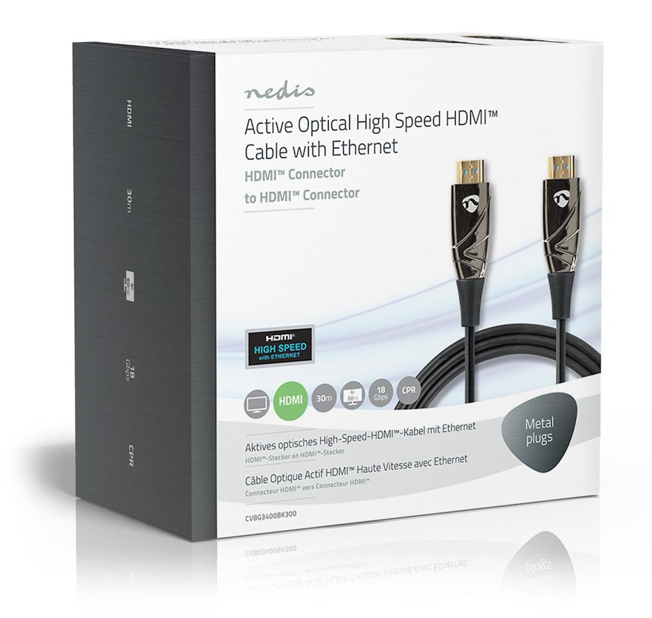 Aktivní optický (AOC) High Speed HDMI 2.0 kabel s Ethernetem a zlacenými konektory je dokonalým řešením pro přenos objemných a vysoce kvalitních dat na dlouhé vzdálenosti téměř bez žádné ztráty. Podporuje přenos videa v rozlišení 4K při 60 Hz. Díky celokovovému pouzdru konektoru je kabel vysoce odolný vůči elektromagnetickému (EMI) a radiofrekvenčnímu (RFI) rušení. Navíc, díky optickému přenosu dat není potřeba žádné externí napájení a signály lze přenášet na delší vzdálenosti než pomocí běžných měděných kabelů.