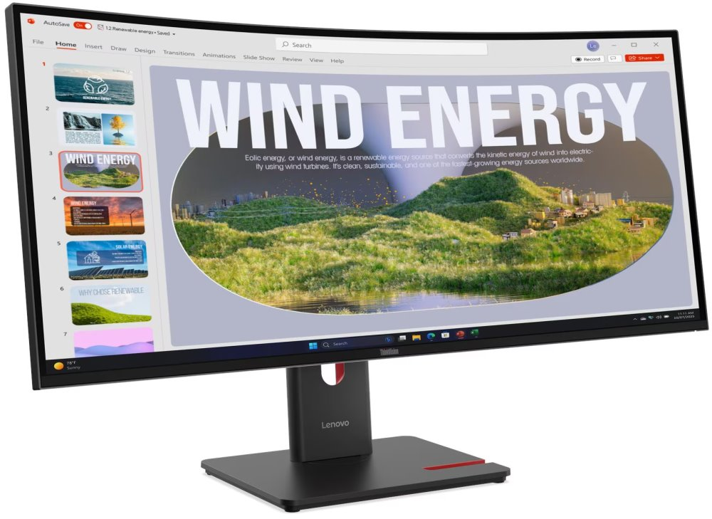 Neopomíná ani bohatou výbavu a konektivitu, a tak se uplatní ve spojení s kancelářským PC, domácí pracovní stanicí nebo při kreativní tvorbě. Prohnutý monitor Lenovo ThinkVision T34w-40 produkuje obraz v rozlišení 3440 × 1440 pixelů ve formátu 21 : 19, díky čemuž je ideální pro práci s více aplikacemi, tabulkami nebo dokumenty.