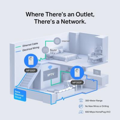 Sada MP300P KIT obsahuje dva powerline adaptéry, které využívají stávající elektrické rozvody v domácnosti k přenosu síťových dat. Technologie HomePlug AV2 zajišťuje stabilní přenos rychlostí až 600 Mb/s na vzdálenost až 300 metrů v rámci jednoho elektrického okruhu. Řešení je ideální pro 4K streaming, online hraní nebo přenos velkých souborů v místech, kde je Wi-Fi signál slabý nebo nestabilní.