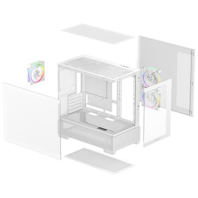 Skříň je osazena třemi PWM ARGB ventilátory – dvěma 120mm reverse-blade ventilátory na boku a jedním standardním 120mm vzadu, s regulací otáček 300–1500 RPM. RGB podsvícení lze ovládat přímo z základní desky nebo vestavěným LED přepínačem. Konstrukce z kombinace materiálů ABS, SPCC a temperovaného skla váží 6,83 kg.