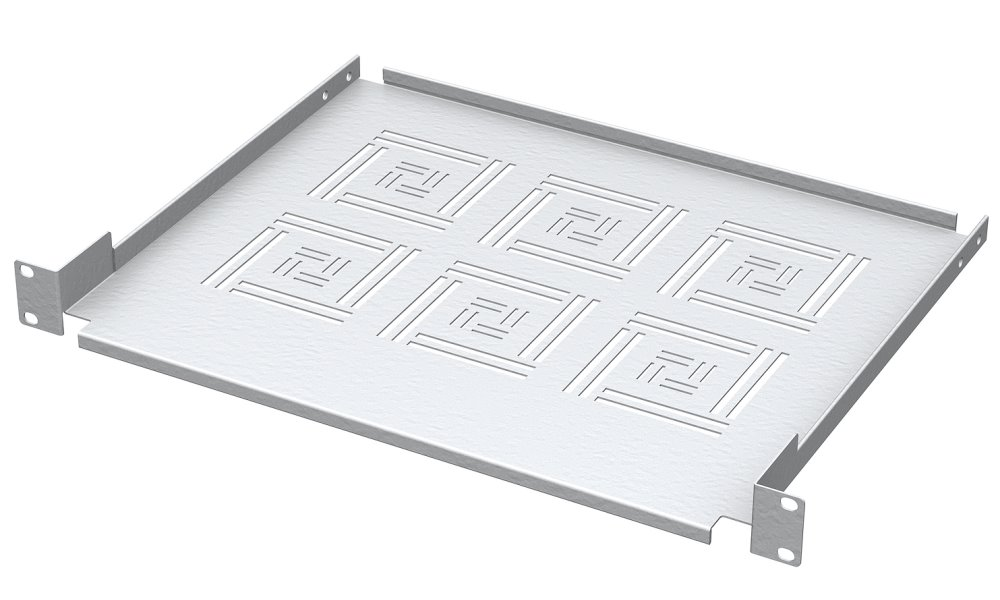 Police je vyrobena z kvalitního materiálu s povrchovou úpravou práškovou technologií ve standardní barvě RAL 7035 (světle šedá). Perforované dno umožňuje efektivní cirkulaci vzduchu a odvod tepla z umístěných zařízení.