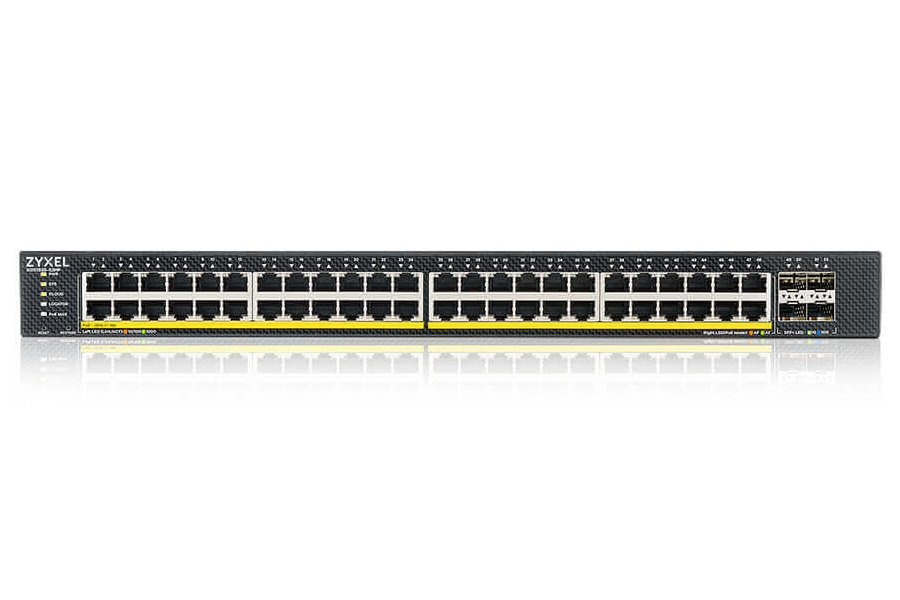 Porty: 48× Gigabit Ethernet PoE+ (RJ-45), 4× 10GbE SFP+