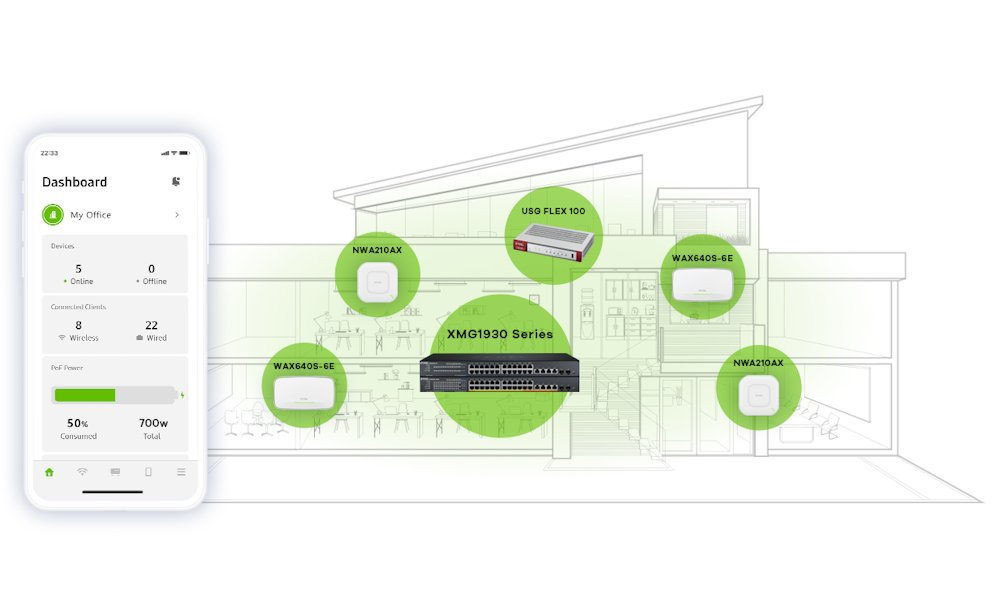 Cloudový management Nebula poskytuje centralizovanou správu celé sítě (switche, AP, security gateway, 5G/LTE routery) s mobilní aplikací. Lokální webové GUI nabízí přístup ke všem funkcím bez nutnosti licence. Podpora SNMP v1/v2c/v3, RMON (1, 2, 3, 9), syslog, LLDP, LLDP-MED a ZyXEL One Network (ZON) utility pro hromadnou konfiguraci.