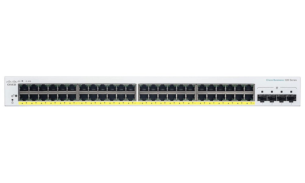 Cisco Business 220 Series CBS220-48P-4G je spravovaný síťový switch navržený pro nasazení v malých a středních firmách. Nabízí 48 portů 10/100/1000 Mbps s podporou PoE+ (IEEE 802.3at) a celkovým PoE budgetem 382 W, což umožňuje napájení až 48 zařízení jako jsou IP telefony, bezdrátové přístupové body nebo IP kamery přímo přes síťový kabel.