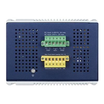 Svorkovnice na horním panelu poskytuje 2× digitální vstup (DI) pro detekci stavu externích zařízení (např. dveřní senzory) a 2× digitální výstup (DO) pro signalizaci událostí jako link down, link up nebo výpadek napájení. Relé výstup pro alarm selhání napájení má kapacitu 1 A při 24 V AC. Digitální vstupy pracují v rozsahu -24 V až +24 V s proudovým odběrem max. 10 mA, výstupy typu open collector zvládají až 100 mA při 24 V DC.