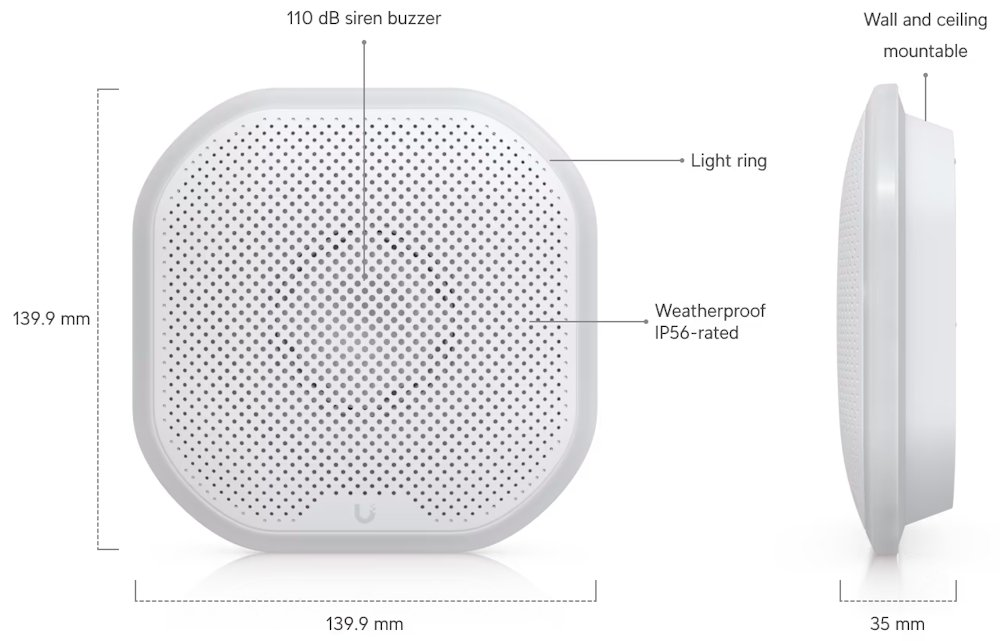 Venkovní bezdrátová siréna pro bezpečnostní systémy UniFi Protect s výkonem 110 dB a integrovaným LED osvětlením.