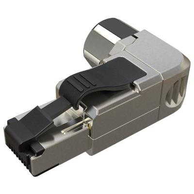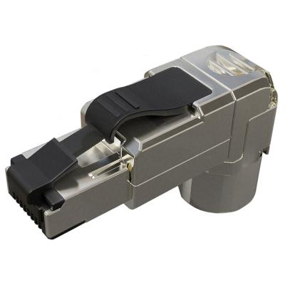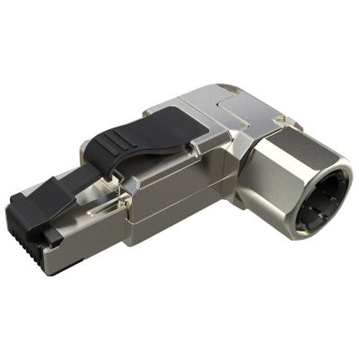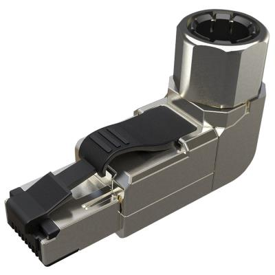 Robustní úhlový konektor kategorie 6A/Class EA s inovativní samořeznou svorkovnicí pro profesionální instalace.