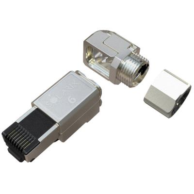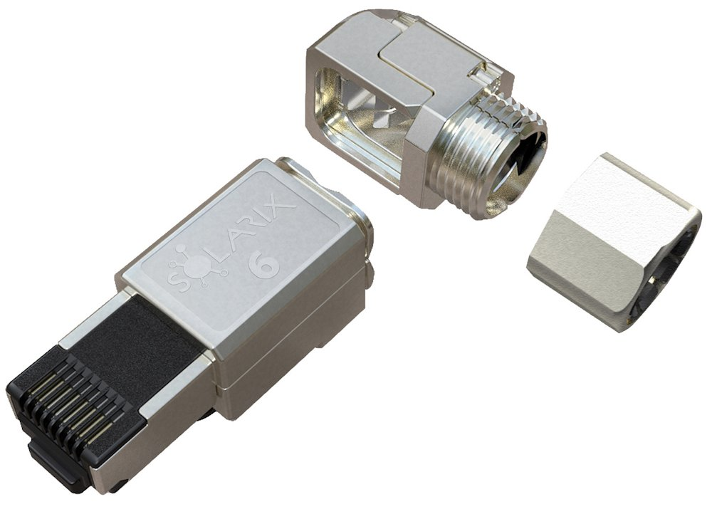 Konektor vyniká prémiovou konstrukcí s pozlacenými kontakty vrstvou 50 µin pro dlouhodobou spolehlivost a minimální přechodový odpor. Kovové tělo v provedení STP (Shielded Twisted Pair) zajišťuje účinné stínění proti elektromagnetickému rušení. Konstrukce je rozebíratelná pro případné opravy nebo úpravy. Unikátní vlastností je možnost nasměrování kabelu do 4 různých stran pod úhlem 90°, což výrazně usnadňuje instalaci v omezeném prostoru.