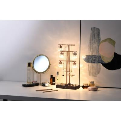 Základna lampičky obsahuje několik přihrádek různých velikostí pro uložení prstenů, náušnic a dalších drobných šperků. Dva vertikální kovové stojany jsou osazeny háčky, na které můžete zavěsit řetízky a náhrdelníky – šperky zůstanou přehledně uspořádané a nezamotají se.