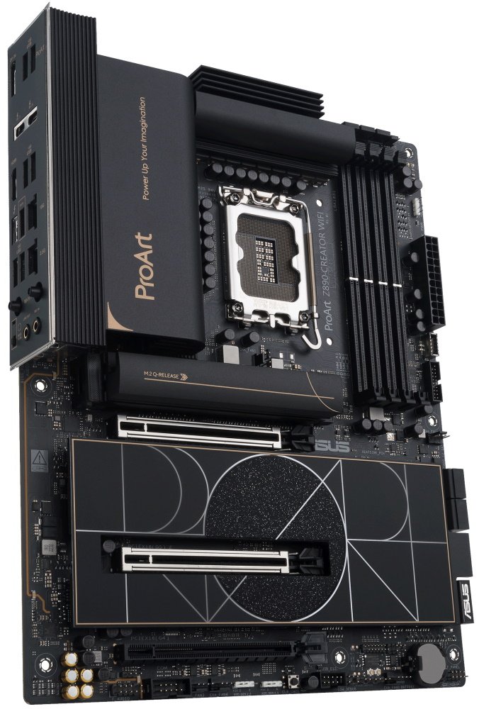 ProArt Z890 CREATOR WIFI představuje špičkové řešení pro profesionální tvůrce všech zaměření. Deska nabízí robustní napájecí systém, který zajišťuje stabilní napájení i těch nejnáročnějších procesorů. Elegantní design v odstínech černé s kovovými zlatými akcenty podtrhuje profesionální charakter tohoto produktu.