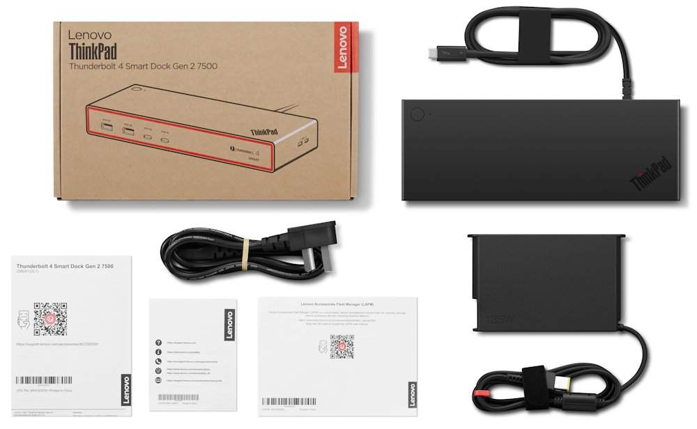 Smart Dock s integrovaným 1m Thunderbolt 4 kabelem, napájecí adaptér 135 W, napájecí kabel, uživatelská příručka.