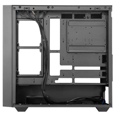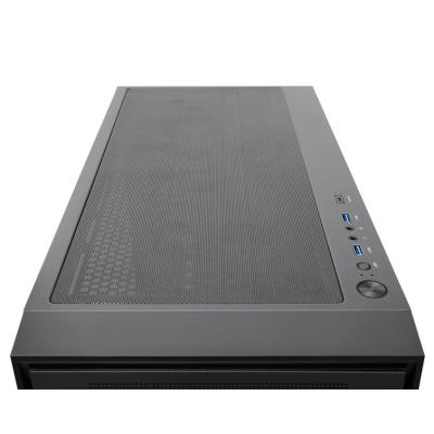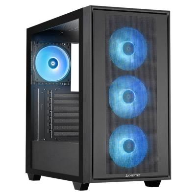 Skříň je vybavena 4× předinstalovanými A-RGB ventilátory 120 mm připojenými k RGB control hubu DF-200, který umožňuje synchronizaci s motherboardem přes 3PIN +5V konektor a PWM regulaci otáček. Prostorná konfigurace s perforovaným ocelovým předním panelem a temperovaným sklem na boku zajišťuje výborné chlazení a elegantní vzhled pro moderní herní systémy.