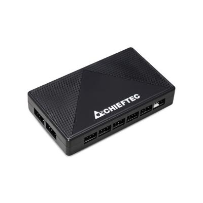 Přiložený RGB control hub DF-200 s 3PIN +5V konektorem umožňuje synchronizaci RGB osvětlení s motherboardem a PWM regulaci otáček ventilátorů. Hub je napájen přes SATA konektor. Front I/O panel poskytuje moderní konektivitu včetně USB 3.2 Gen2 Type C, 2× USB 3.0 portů a HD audio konektorů (AZALIA).