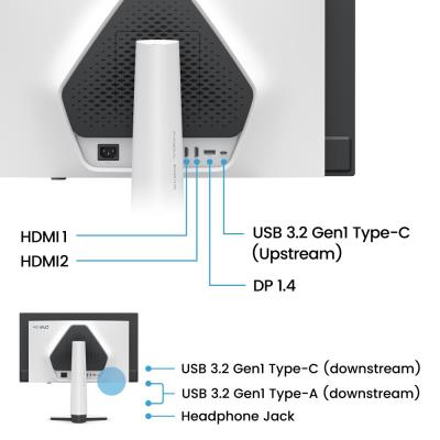 Konektory: 2× HDMI 2.1 (1× s eARC), 1× DisplayPort 1.4, 1× USB-C upstream, 2× USB-A downstream, 1× USB-C downstream, jack 3,5 mm