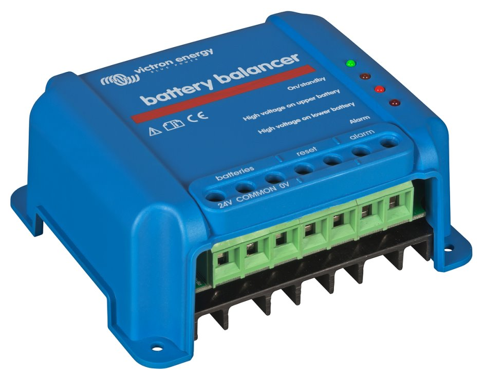 Victron Battery Balancer The Battery Balancer equalizes the state of charge of two series connected 12 V batteries, or of several parallel strings of series connected batteries. When the charge voltage of a 24 V battery... more